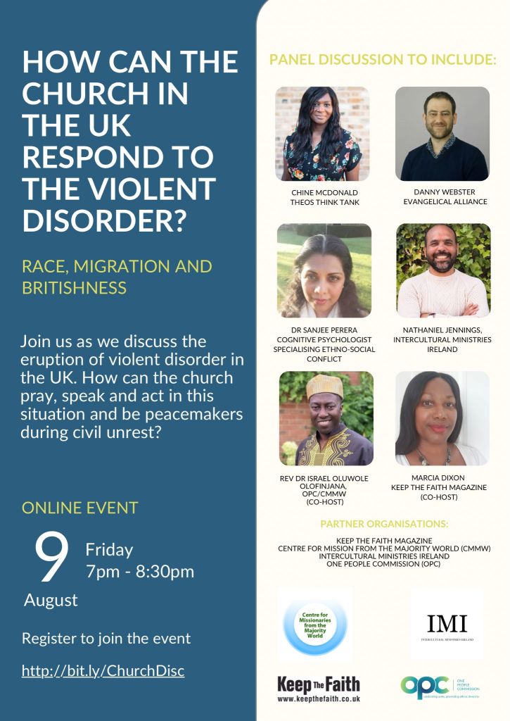 How can the UK Church be prophetic in this season with the violent disorder that is raging cities and towns? What would be the prophetic role of the church in this fragile, fragmented context, and how can we speak and challenge racism of all types that can lead to a vision of an integrated just society? This Friday, we are hoping to have some conversation on How can the UK Church respond to the Violent disorder? Race, Migration and Britishness! You do not want to miss this!